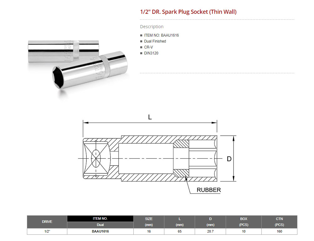SIZE(16mm) 1/2" DR. Spark Plug Socket(Thin Wall)