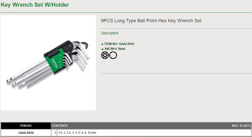 SIZE(mm) 9PCS -Long Type Ball Point Hex Key Wrench Set